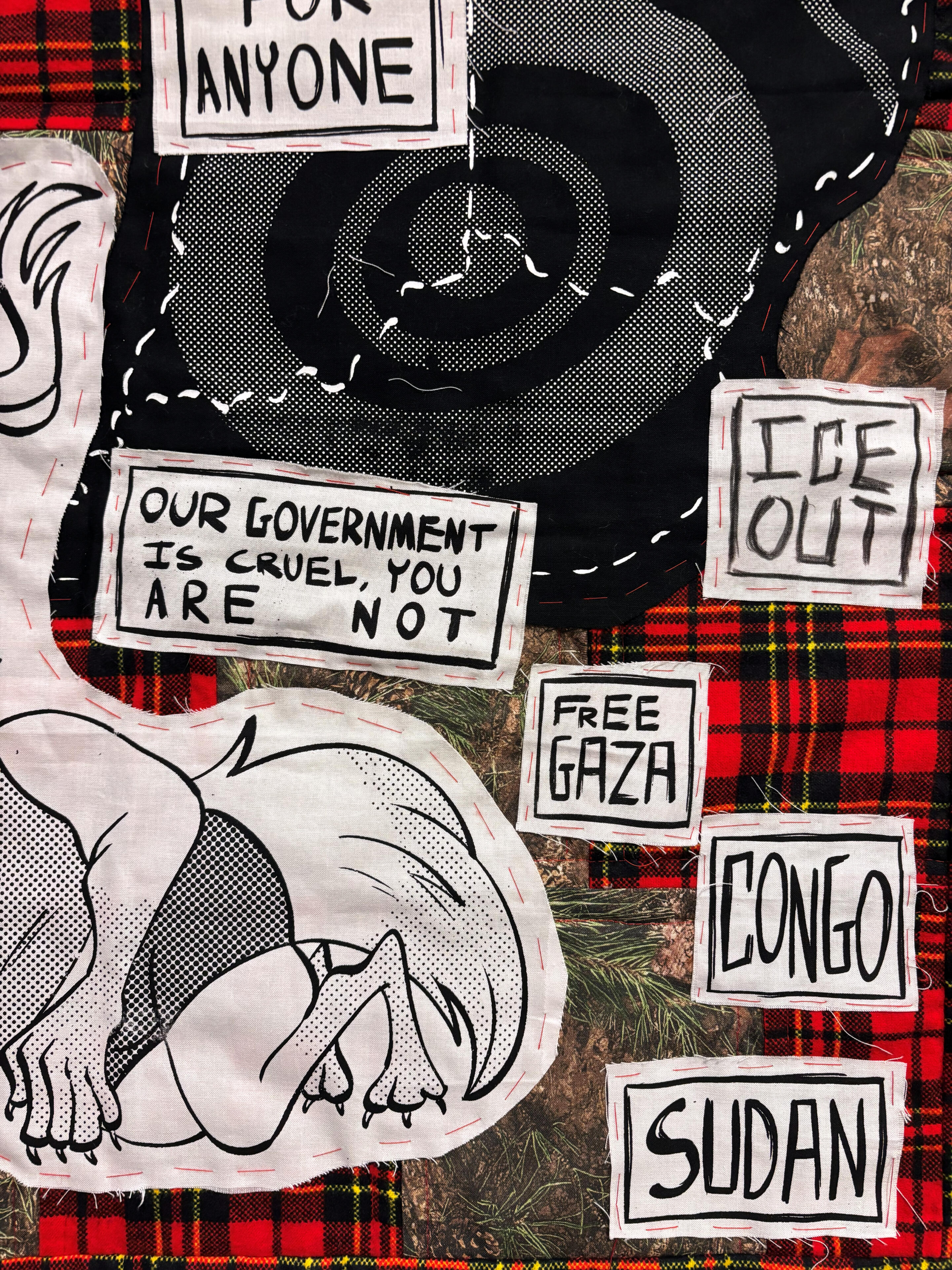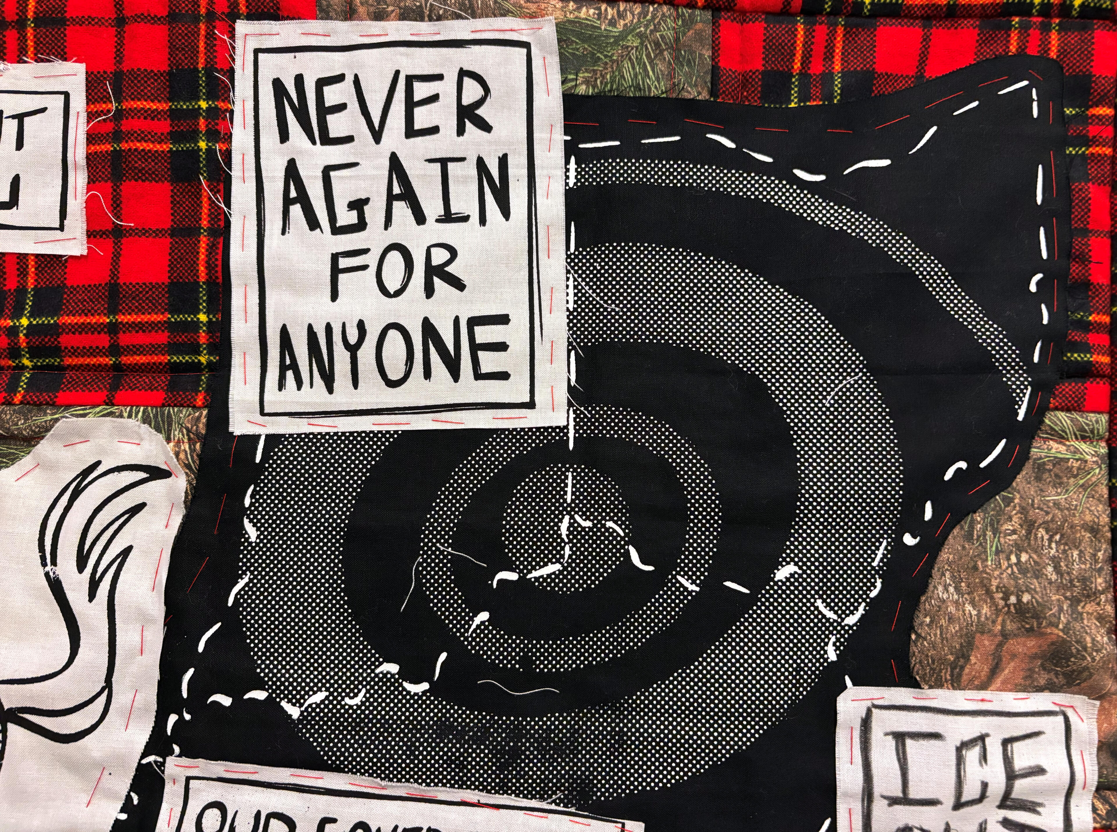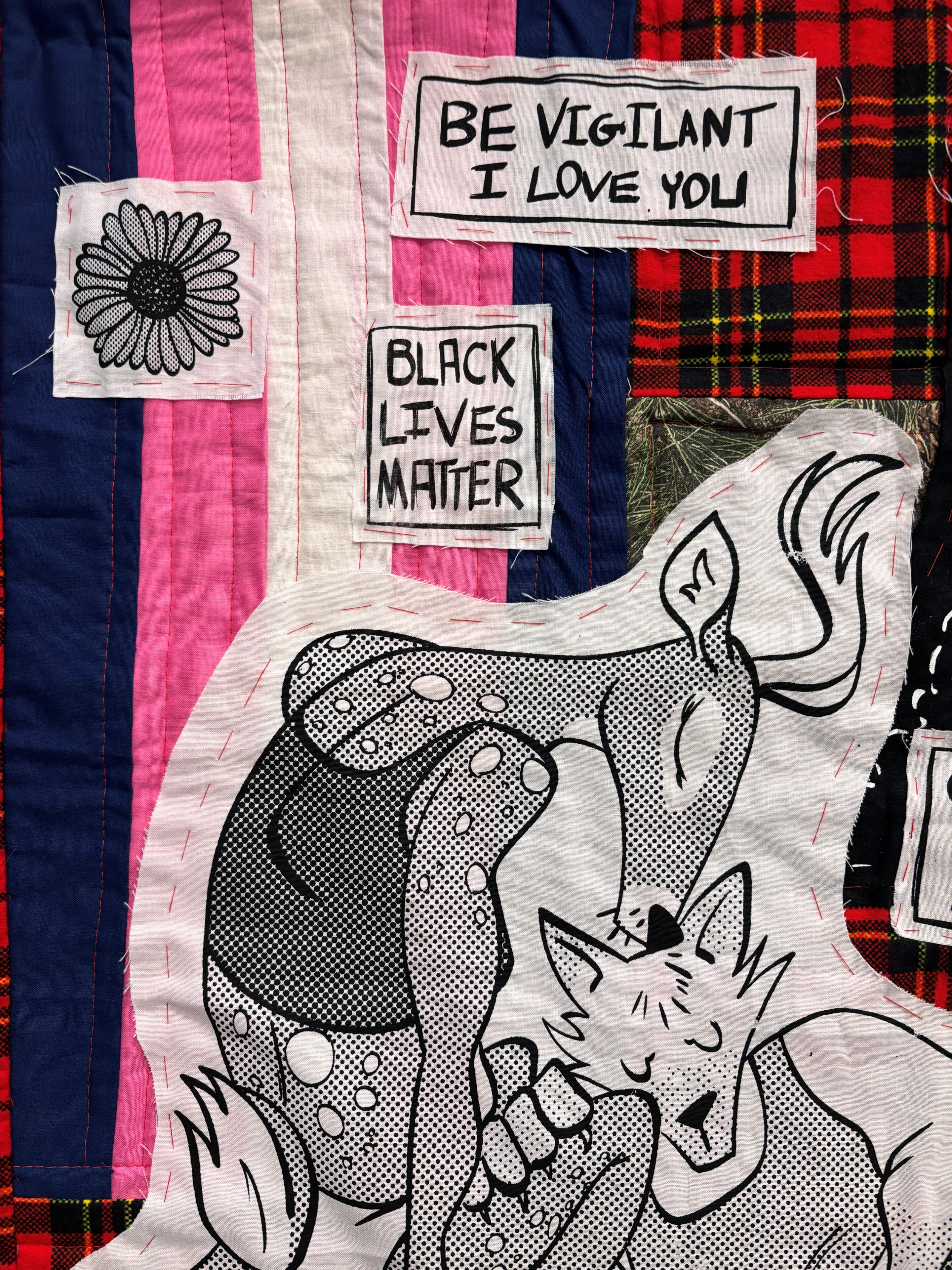 For my quilted piece, We Are Still Here, I was inspired by the communities I’ve witnessed and been in around Ohio. Too many times I’ve heard dismissive statements about red states, inferring that the marginalized people there simply do not exist—I have always lived the contrary. This work is a dedication to those who have tirelessly been activists and advocates for their communities, as I would not be half the artist today without them. Through the usage of familiar flannel and camo fabrics, as well as printed DIY patches, I wish to reiterate that we have always been here and will never leave.